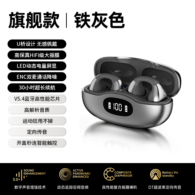 无感佩戴,独特U桥设计,超宽频空间声场,DT6.0 定向传音,ENC双麦通话降噪,电量数显